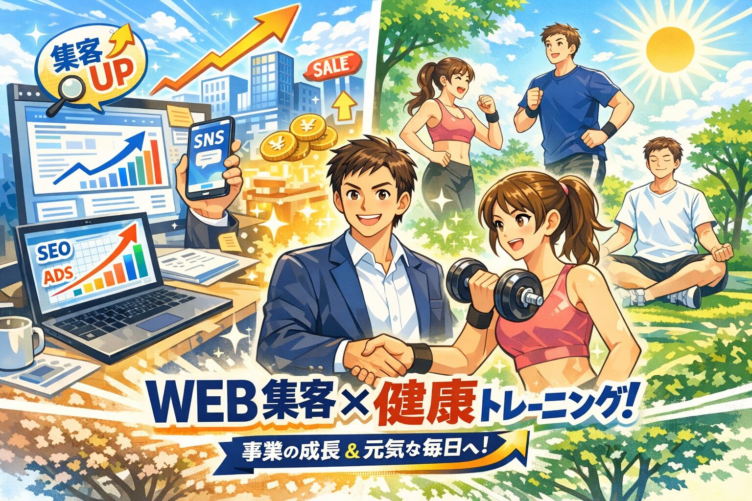 新サービスのお知らせです! Webでの集客に悩み、多忙な日々で自身の健康も気になる経営者の方に向けて、筋トレとWeb戦略のパーソナルコーチングサービスを提供開始します! 「でも、そう言いながら、筋トレとかW…